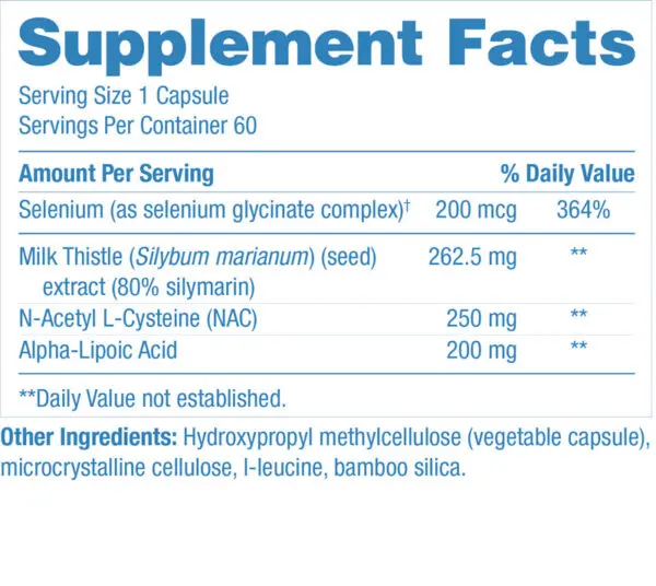 Our Liver Support is a comprehensive nutritional liver support containing four key ingredients to support healthy liver function and protection. It includes N-acetyl cysteine (NAC) which serves as a precursor for the synthesis of glutathione (a powerful detoxifier), alpha-lipoic acid (ALA) which is a powerful antioxidant and free-radical scavenger, silymarin (standardized extract from milk thistle) which protects the liver and helps neutralize a number of toxins, and selenium which is a trace mineral known to naturally increase glutathione levels*